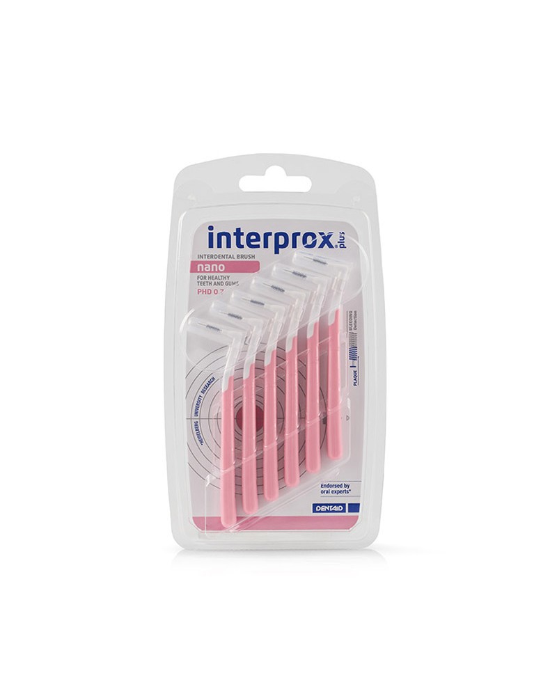 Interprox® plus nano wurde speziell zur Entfernung von oralem Biofilm (bakteriellem Zahnbelag) entwickelt, der sich in den Zahnzwischenräumen angesammelt hat. Der zylindrische Bürstenkopf passt in die kleinsten Zahnzwischenräume. (Größe: PHD=0,7)