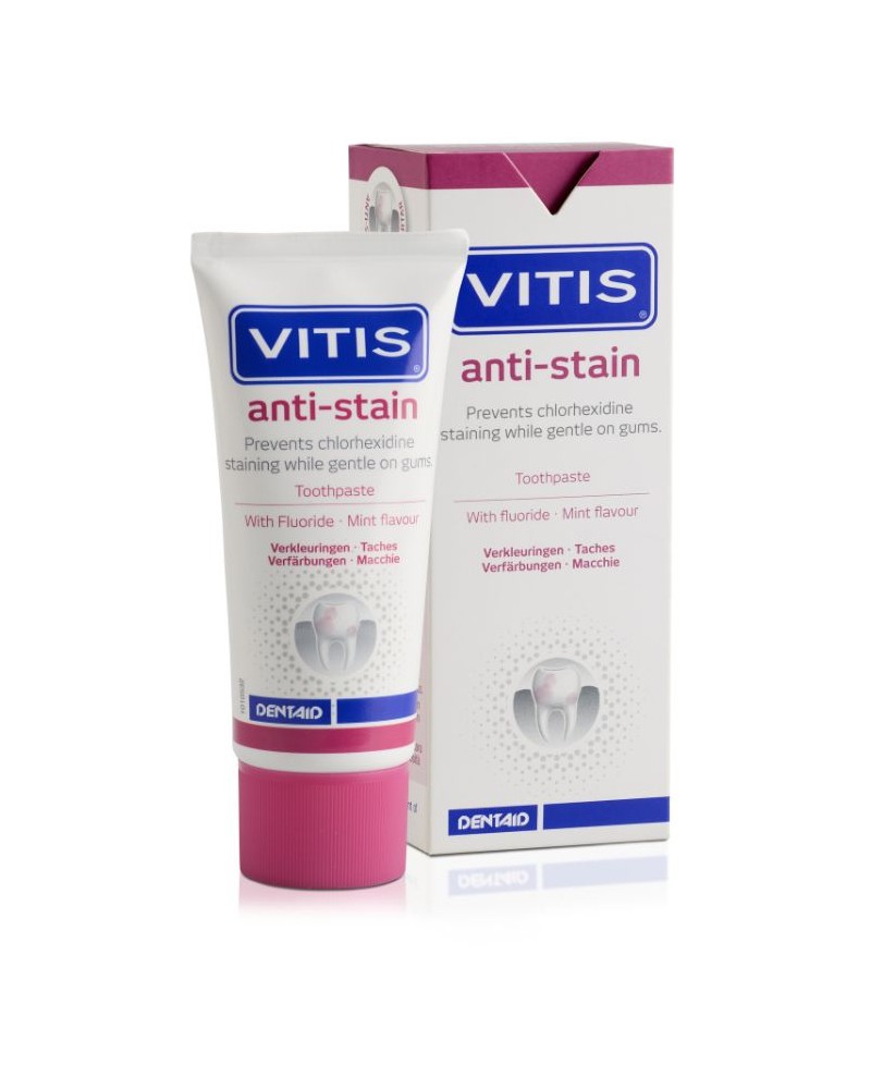 VITIS® anti-stain Zahnpasta verhindert Verfärbungen auf der Zahnoberfläche, ohne die Wirkung von Chlorhexidin zu beeinträchtigen. Das Produkt ist sanft zum Zahnfleisch. Es eignet sich daher hervorragend für Patienten, mit Problemen bei einer Paroadontalbehandlung oder nach einem oralen Eingriff (Parodontalchirurgie, Einsetzen von Implantaten oder Exodontie), die sich anschließend einer antiseptischen Chlorhexidin-Mundspülung unterziehen.
